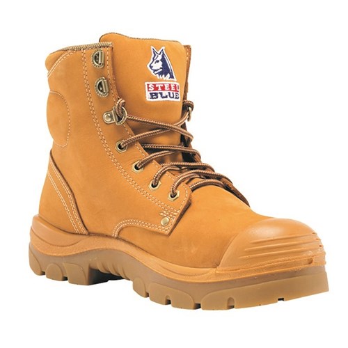 Steel blue argyle 150mm lace up safety boot with nitrile sole and bump cap.
